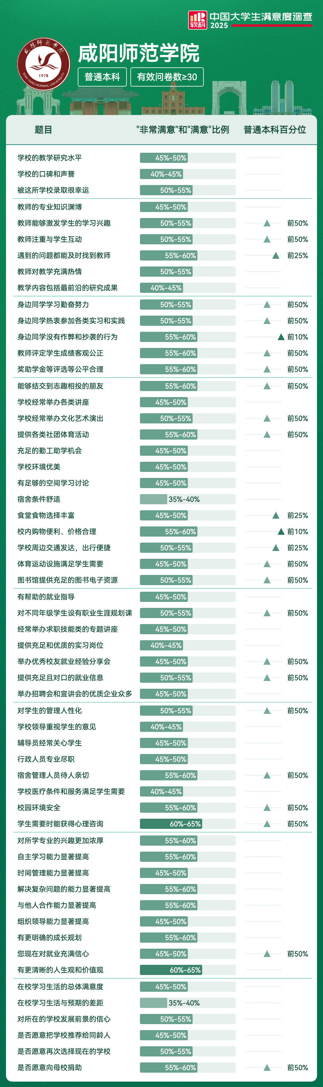 | 食堂食物选择丰富 | 45%-50% | 前25% |