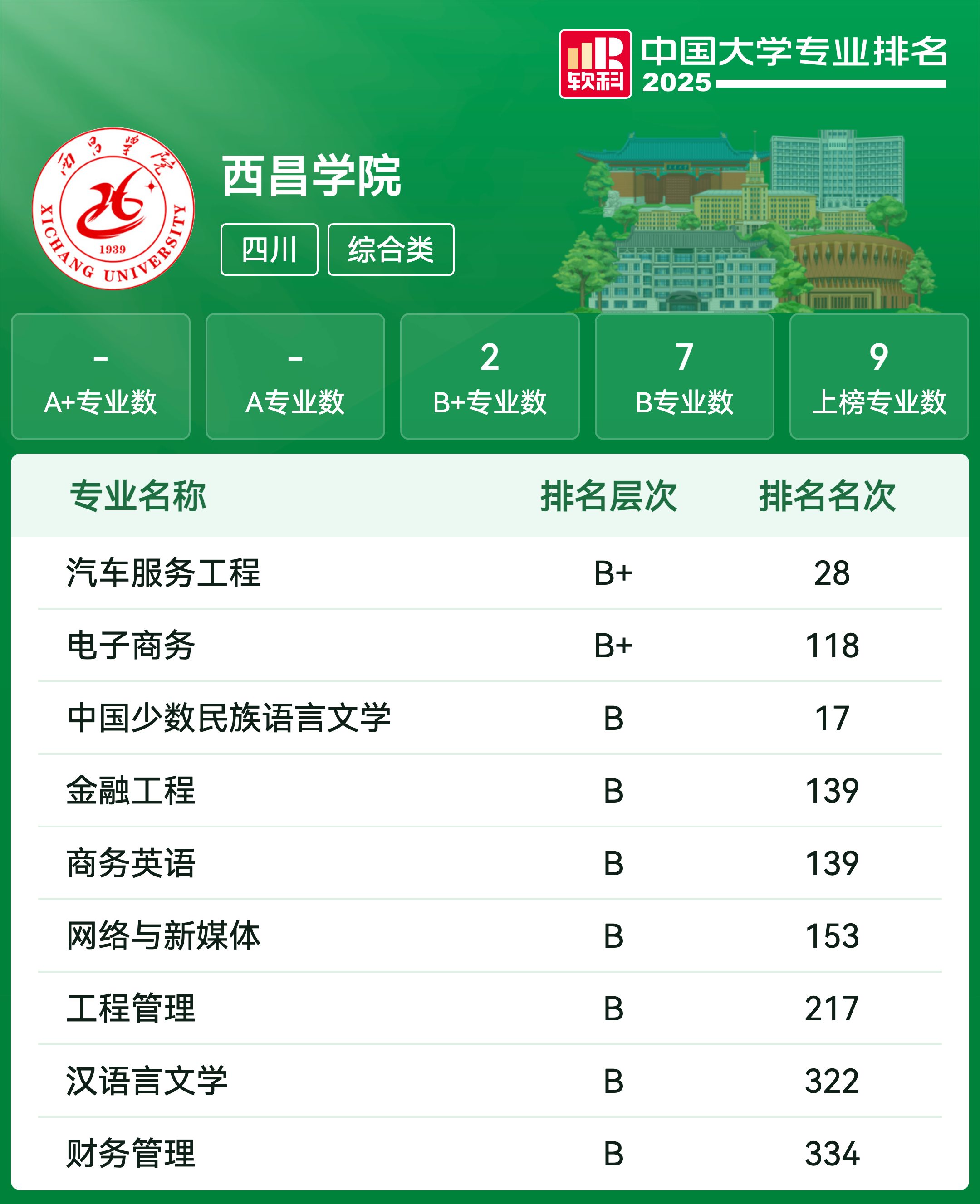 | 专业代码 | 专业名称 | 评级 | 专业排名 |