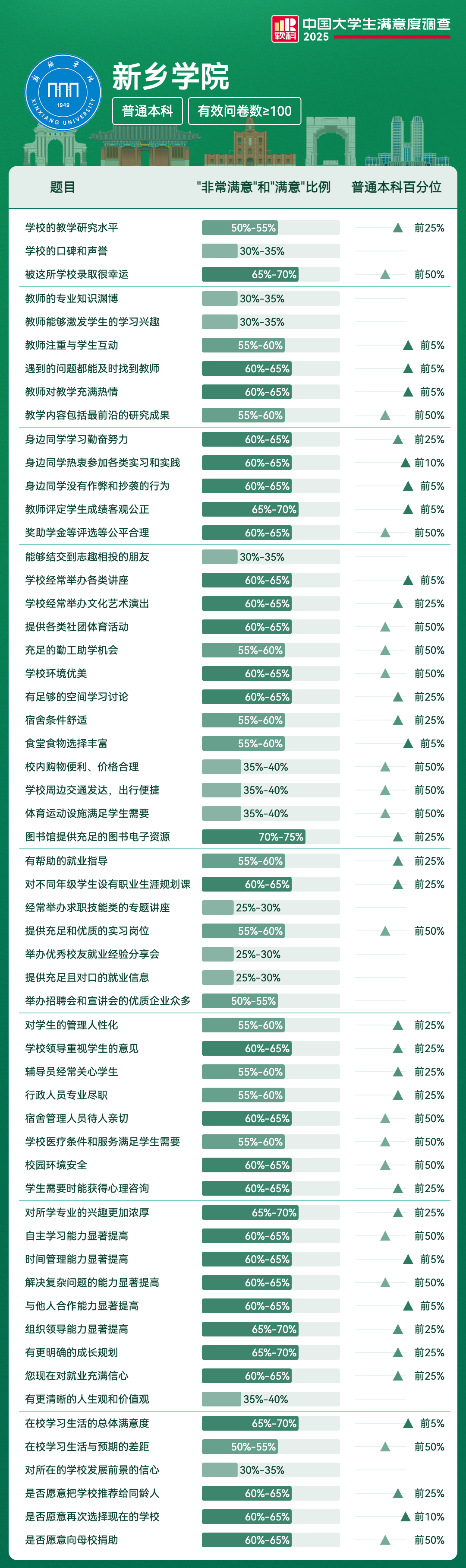 | 满意度前5项 | 满意及以上比例 | 全国高校排名区间 |