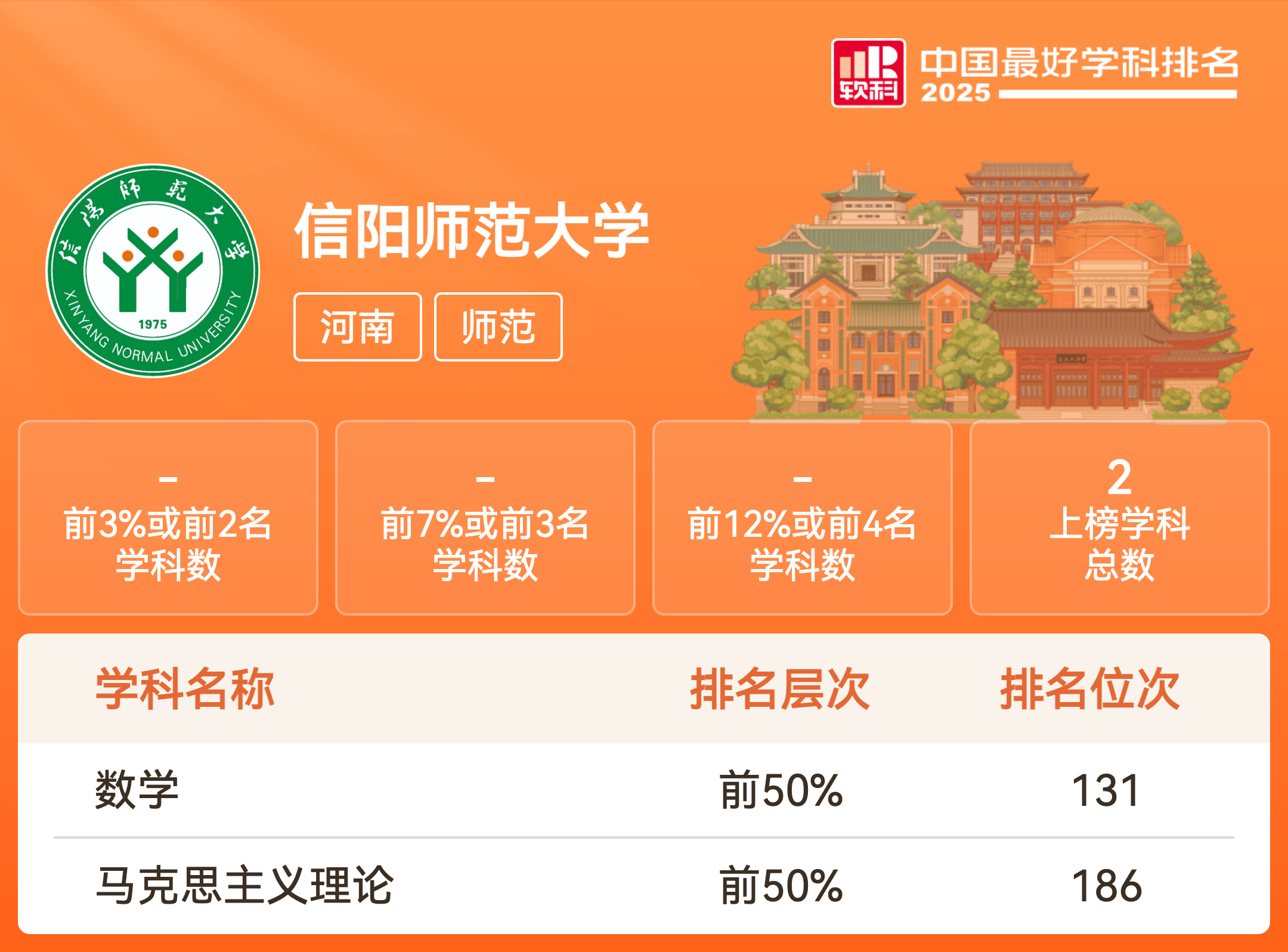 信阳师范大学(Xinyang Normal University),简称信阳师大(XYNU),是我国改革开放后河南省创办的第一所本科高校,是河南省重点建设的两所师范大学之一,是大别山地区一张闪亮的高等教育名片,被著名社会活动家、教育家费孝通先生誉为“教师之摇篮”,被赞为“河南省最美的高校”“办在花园中的大学”“在绿水青山中自由自在学习的好大学”。 学校创建于1975年,时名开封师范学院(今河南大学)信阳分院,1978年经国务院批准为本科建制并改为信阳师范学院,1998年经国务院学位委员会批准为硕士学位授权单位,2018年获批省“十三五”博士学位授权立项建设单位,2021年确立为河南省博士学位授予重点立项培育单位。2023年6月,教育部同意信阳师范学院更名为信阳师范大学。