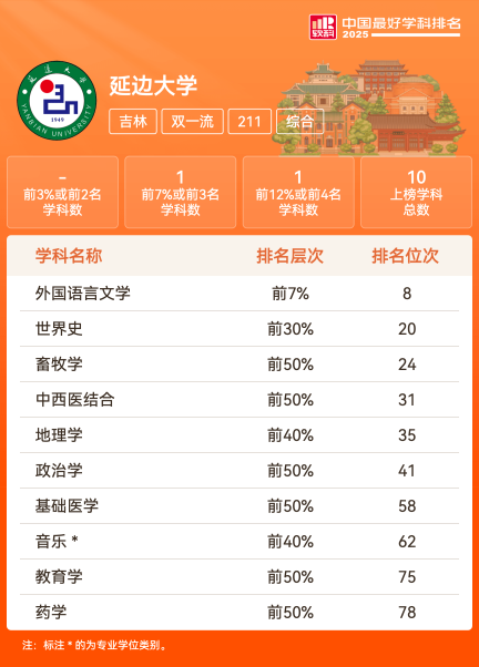 延边大学始建于1949年,曾隶属于高教部,1957年划归吉林省所属。1958年8月,延边大学分立为延边大学、延边医学院、延边农学院、延边工学院。1996年经国家教委批准,原延边大学、延边医学院、延边农学院、延边师范高等专科学校、吉林艺术学院延边分院合并组建新的延边大学。同年9月,中外合作办学机构——延边科学技术大学(筹)并入延边大学。延边大学是国家“双一流”建设高校、国家“211工程”重点建设大学、西部开发重点建设院校、吉林省人民政府和教育部共同重点支持建设大学、吉林省人民政府和国家民委共同重点支持建设大学,入选“中西部高校基础能力建设工程”、“国家建设高水平大学公派研究生项目”、“卓越医生教育培养计划”、“卓越农林人才教育培养计划”、国家“111计划”等。