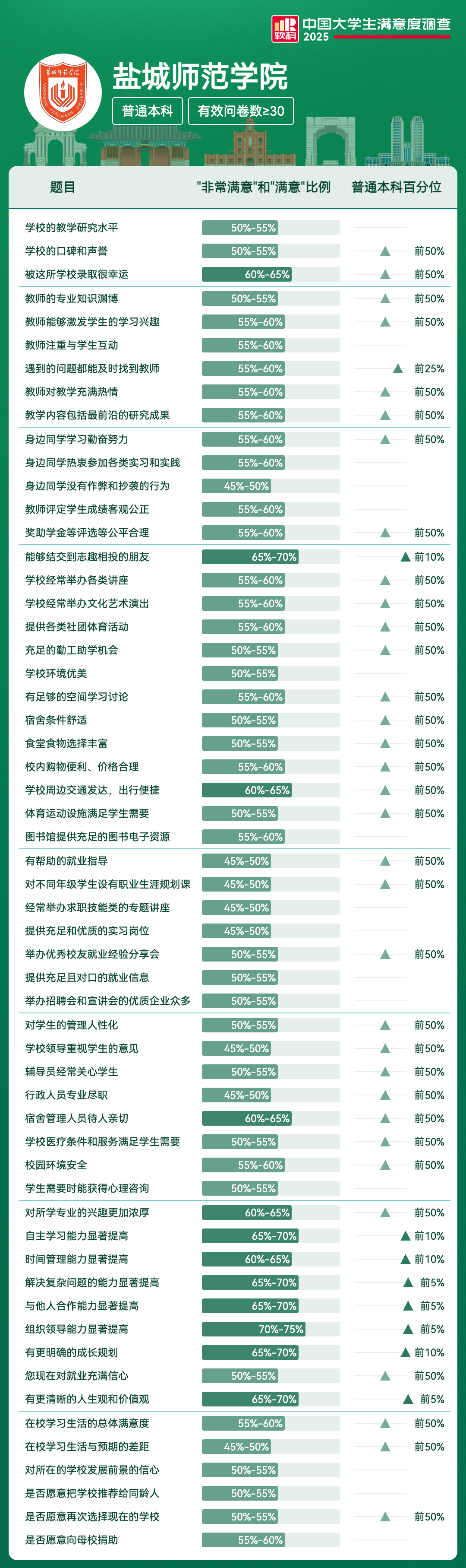 | 满意度前5项 | 满意及以上比例 | 全国高校排名区间 |