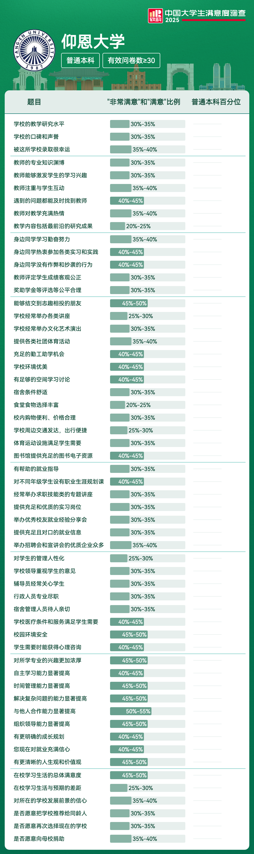 满意度前5项 | 满意及以上比例 | 全国高校排名区间 |