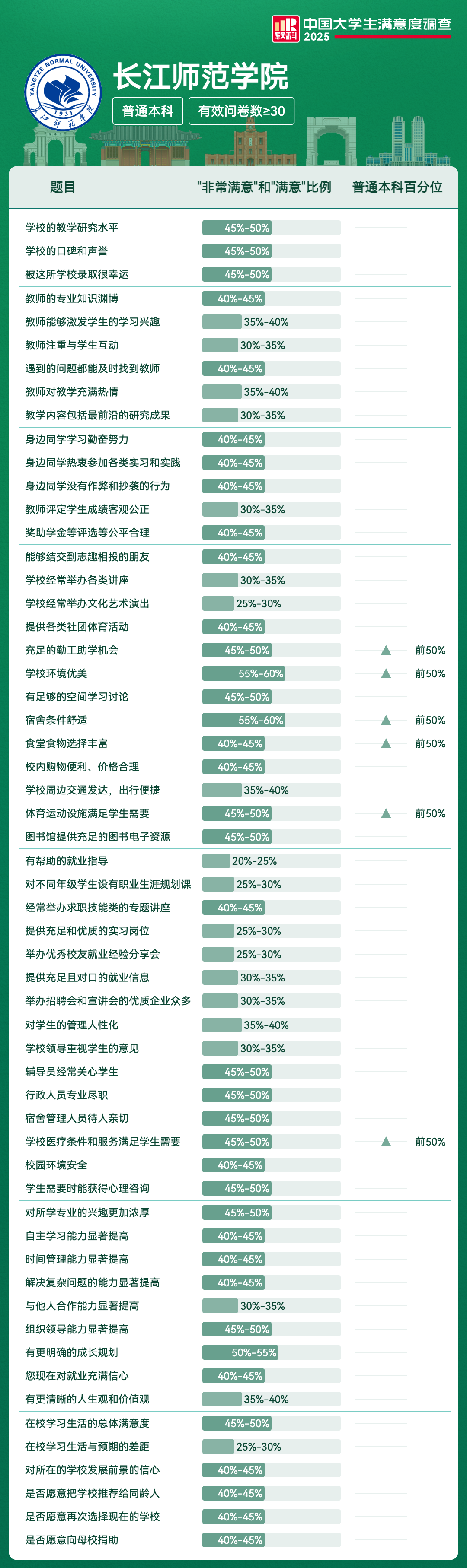 | 宿舍条件舒适 | 55%-60% | 前50% |
