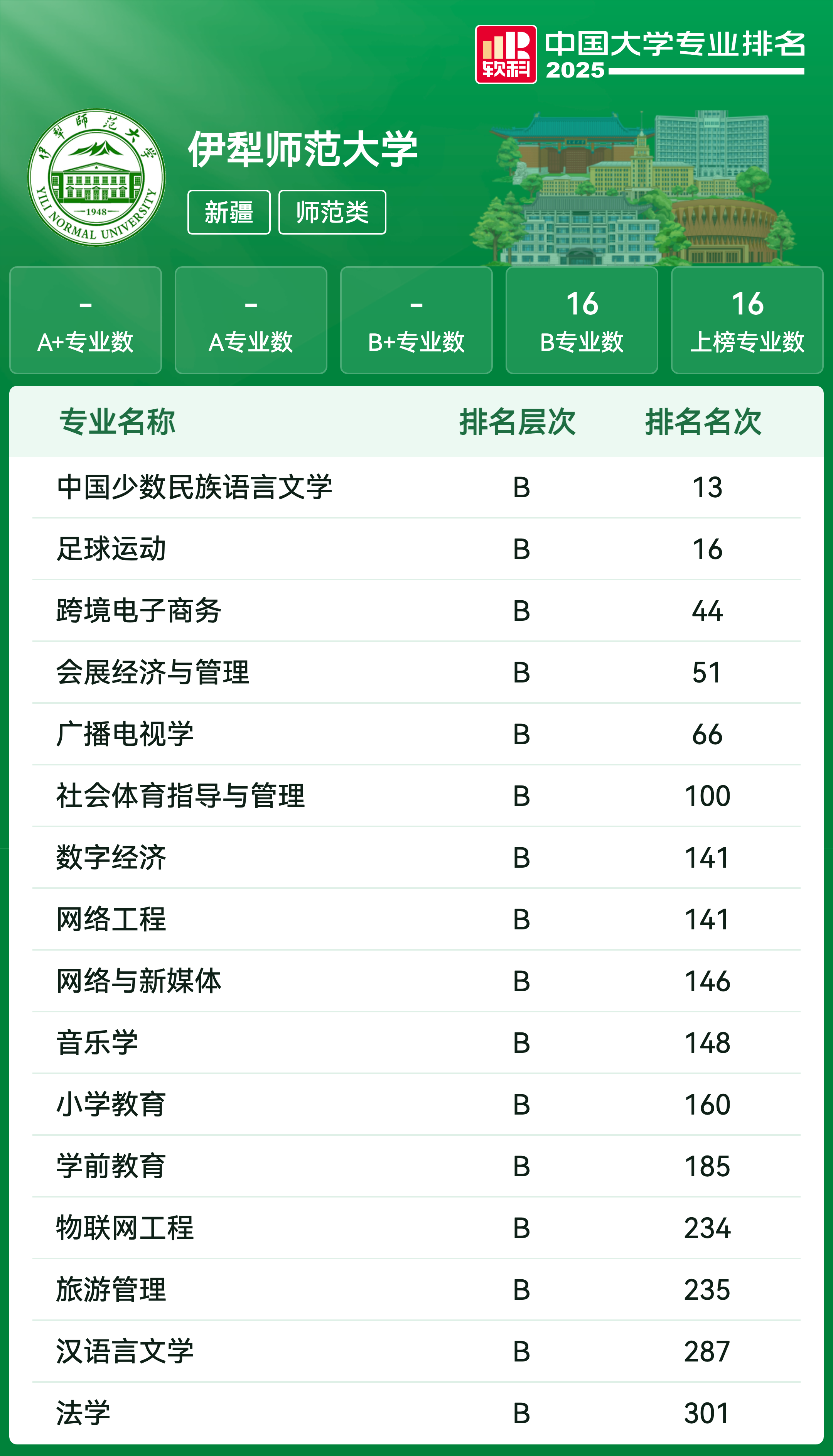 | 专业代码 | 专业名称 | 评级 | 专业排名 |