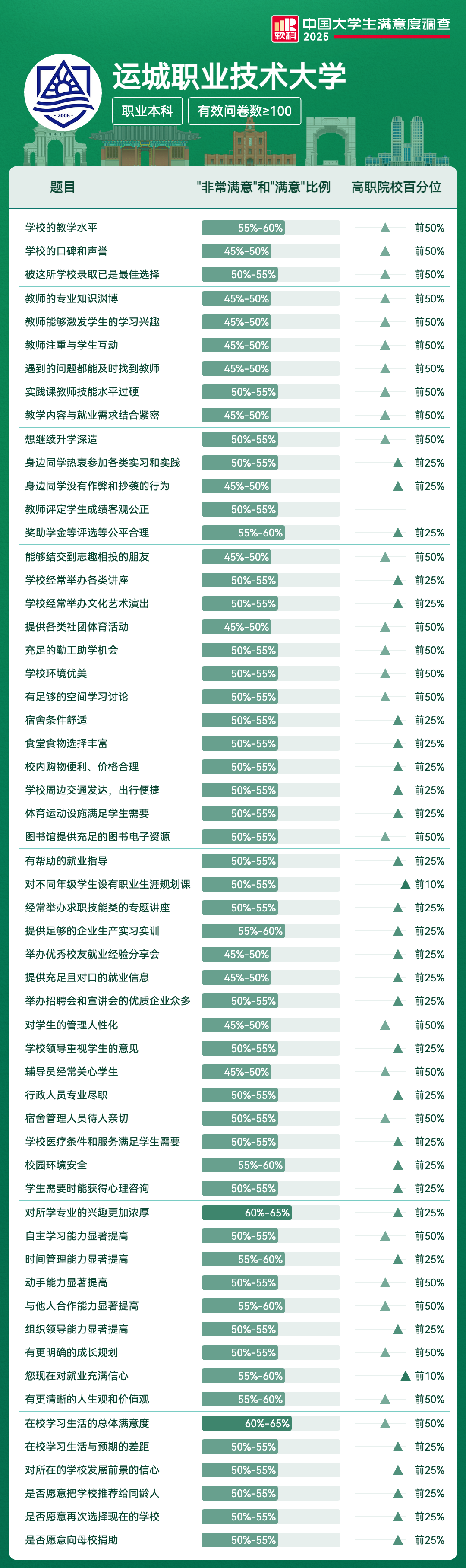 | 满意度前5项 | 满意及以上比例 | 全国高校排名区间 |