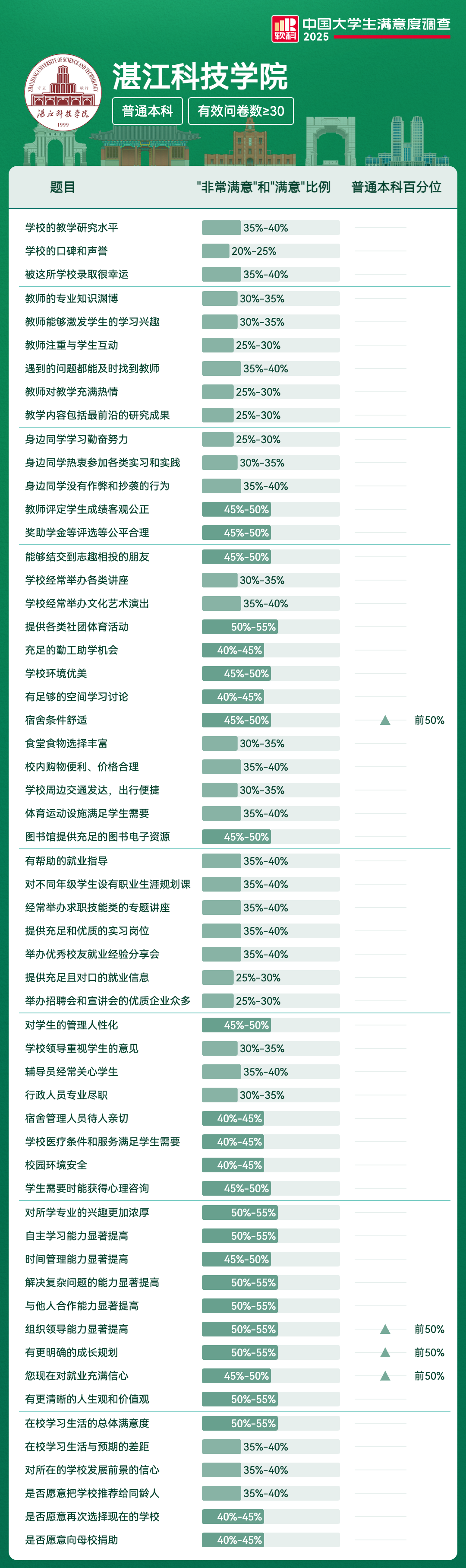 | 宿舍条件舒适 | 45%-50% | 前50% |