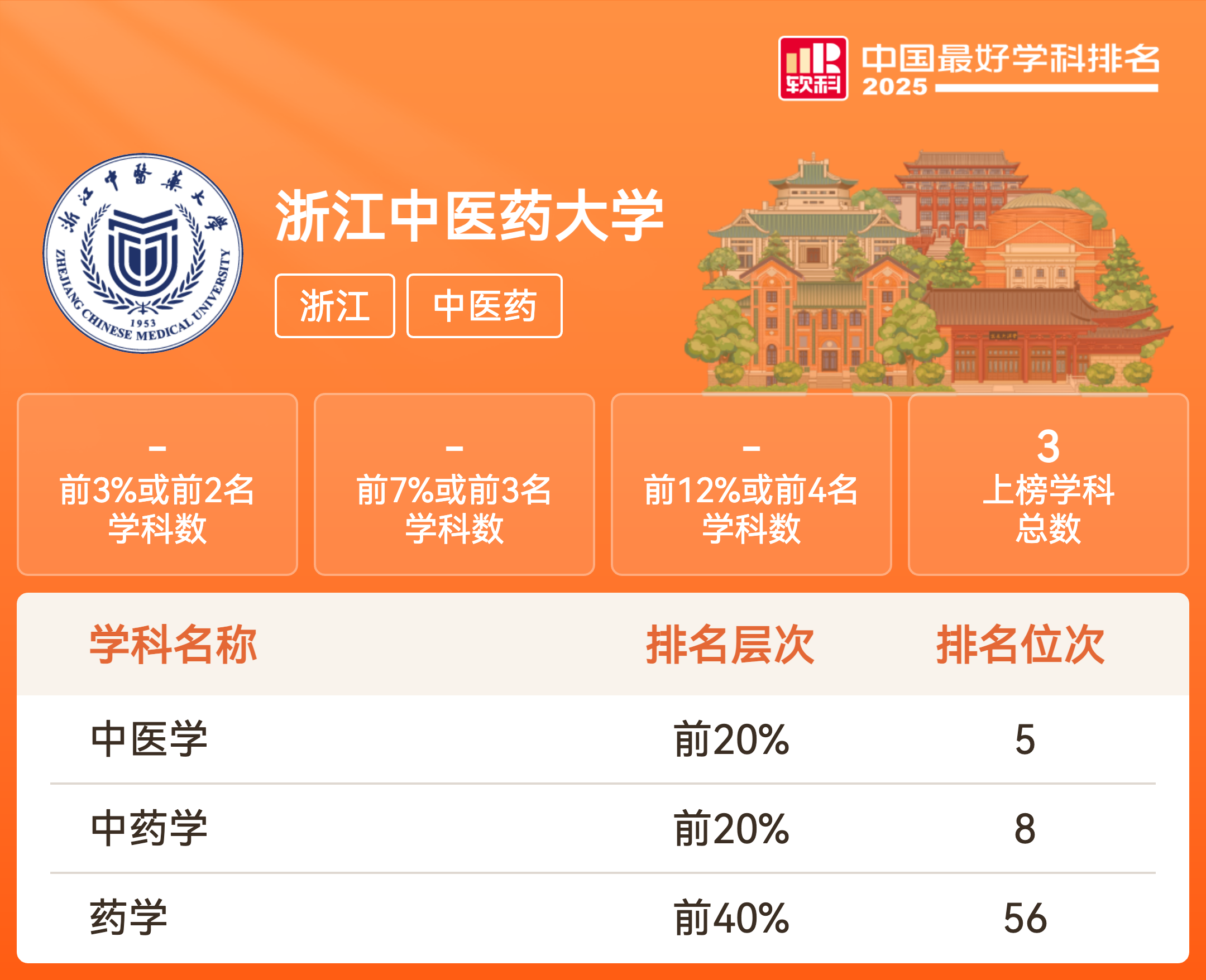 实力雄厚,特色鲜明。学校是全国首批招收培养中医药研究生、在浙江省属高校中首批获博士学位授予权和博士后科研流动站的院校。现有中医学、中药学、中西医结合3个一级学科博士学位授权点及中医博士专业学位授权点。