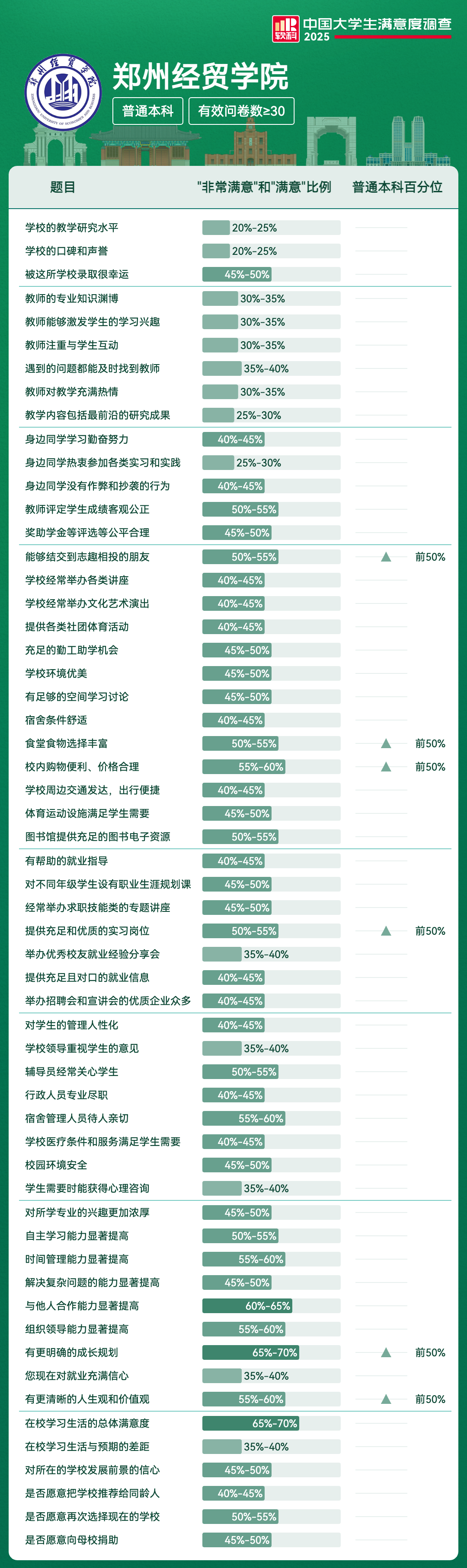 | 食堂食物选择丰富 | 50%-55% | 前50% |
