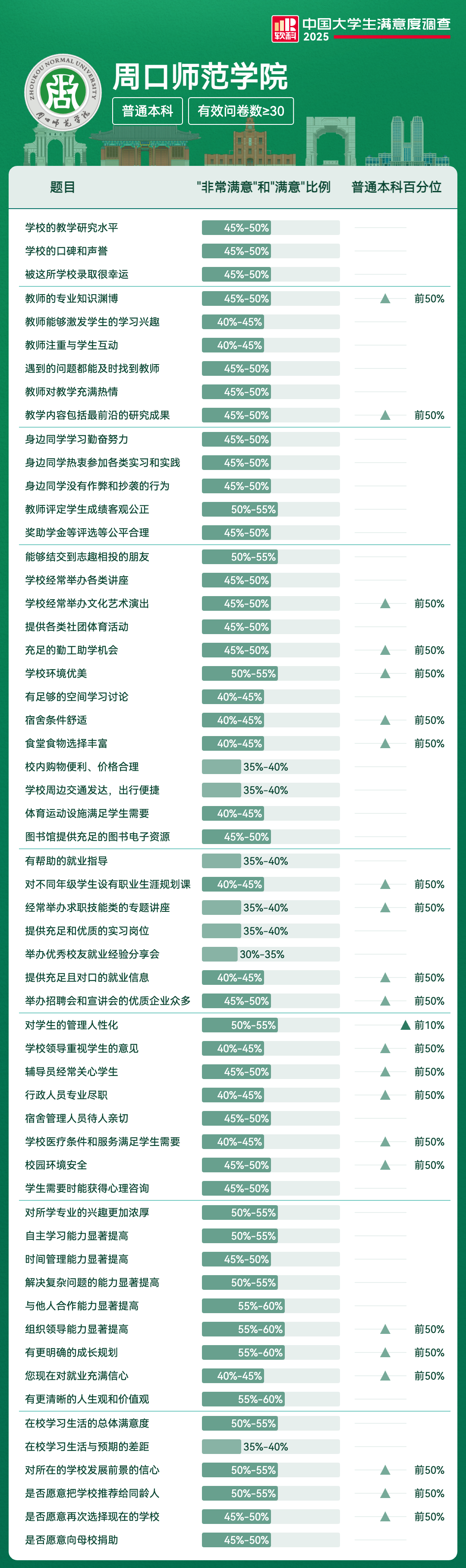 | 对学生的管理人性化 | 50%-55% | 前10% |