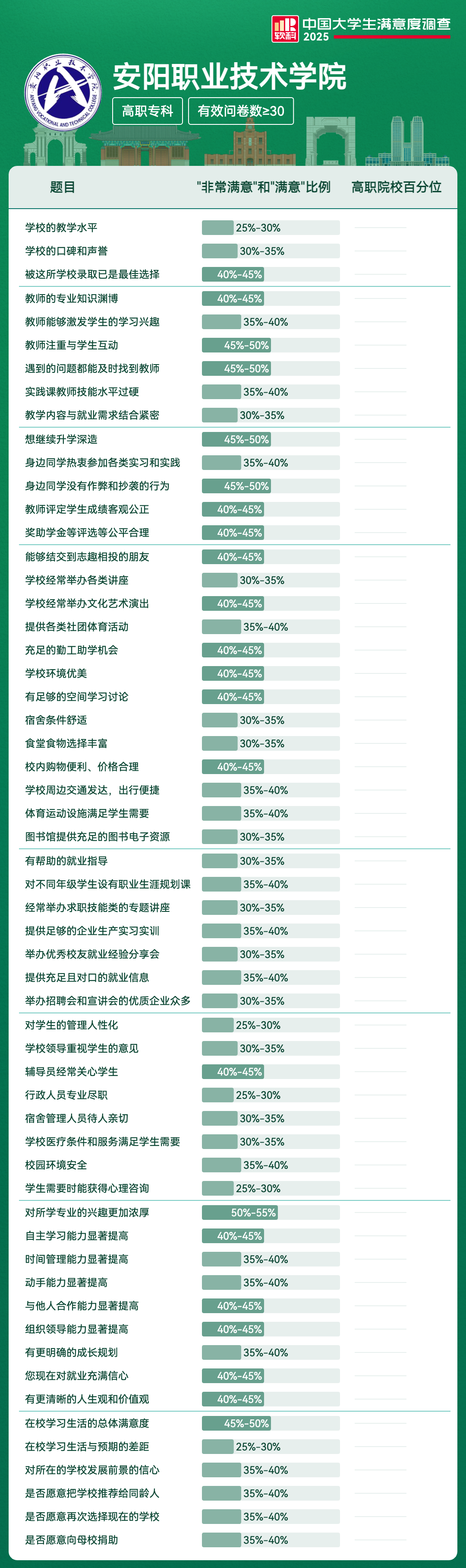 | 满意度前5项 | 满意及以上比例 | 全国高校排名区间 |