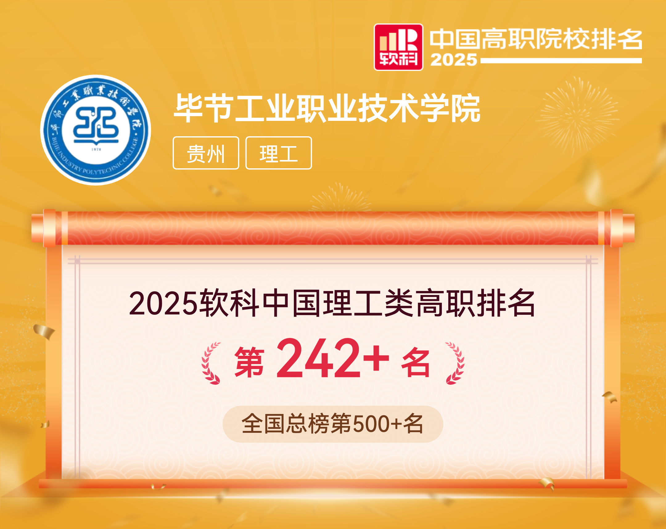 软科中国高职院校排名于2023年首次发布。排名旨在用丰富的客观数据对中国高职高专院校的办学水平进行监测式评价,为考生择校和社会了解中国千余所高职高专院校提供参考。