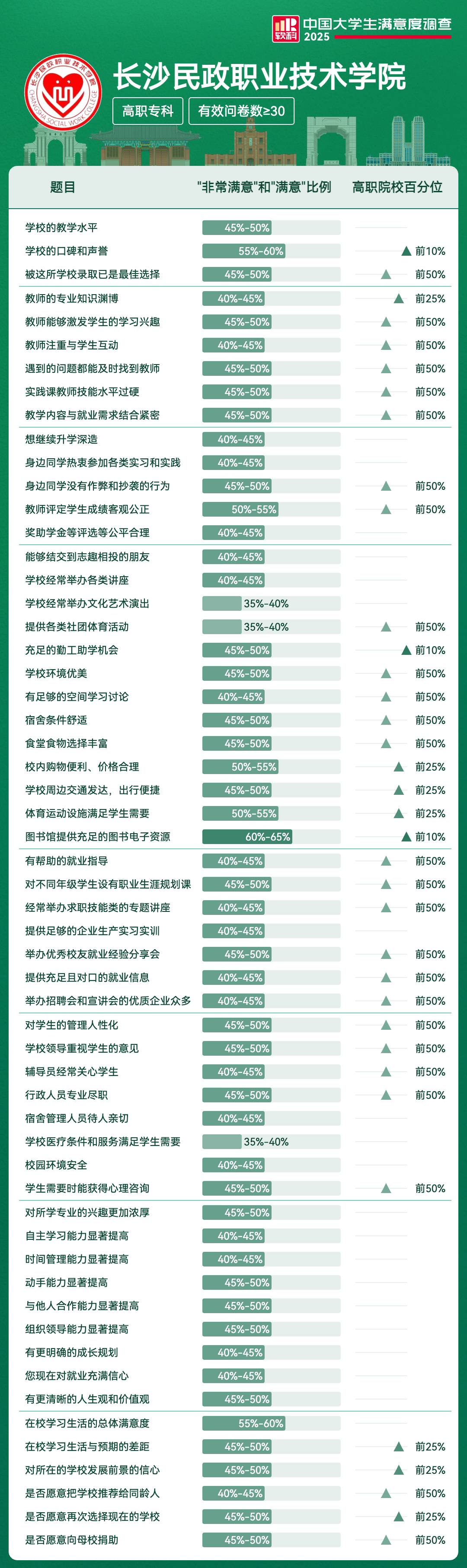 | 满意度前5项 | 满意及以上比例 | 全国高校排名区间 |