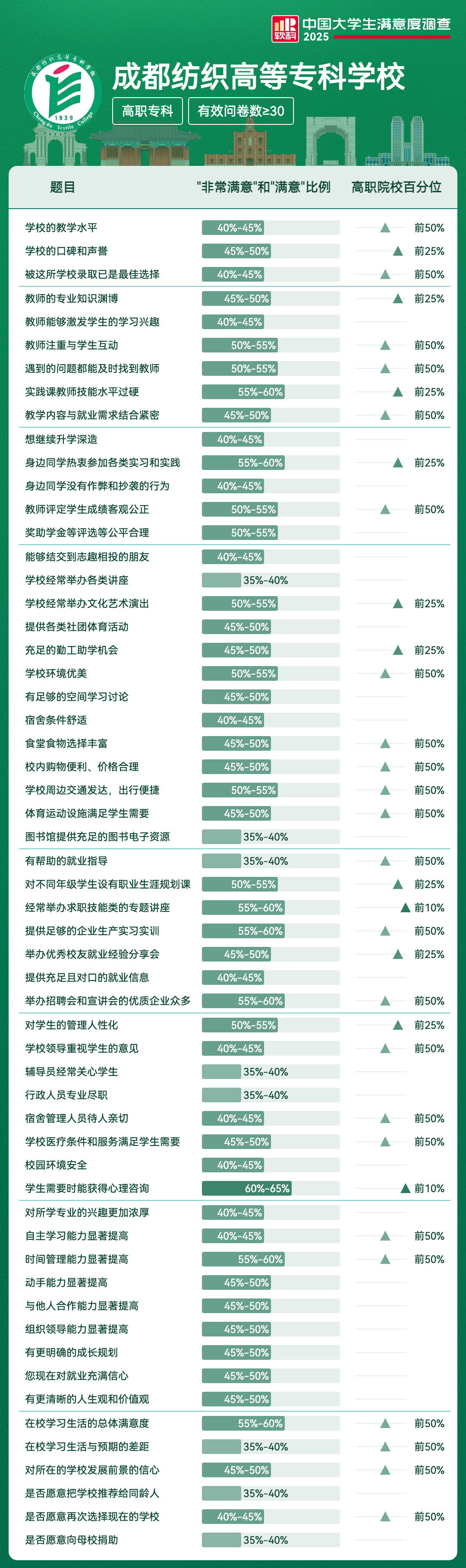 | 满意度前5项 | 满意及以上比例 | 全国高校排名区间 |
