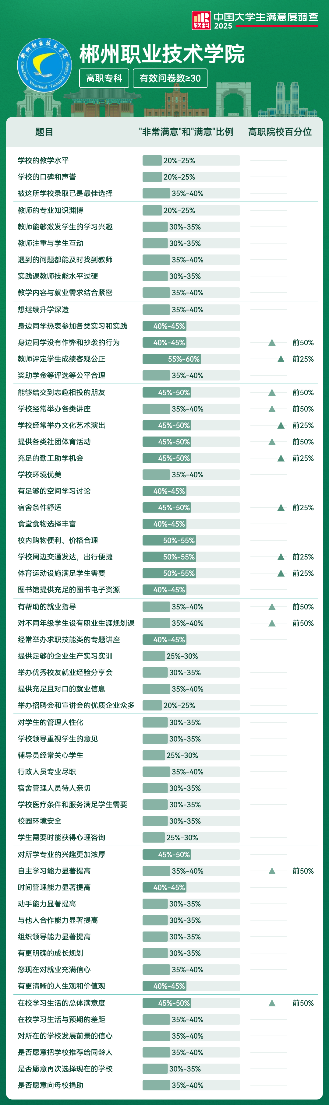 | 宿舍条件舒适 | 45%-50% | 前25% |