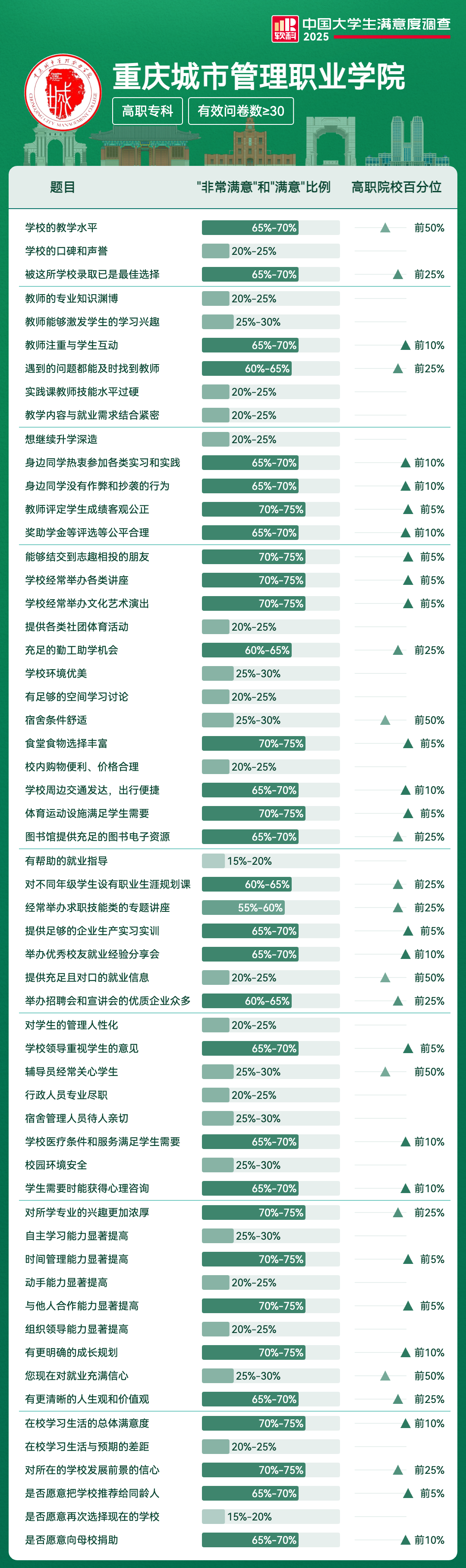 | 满意度前5项 | 满意及以上比例 | 全国高校排名区间 |