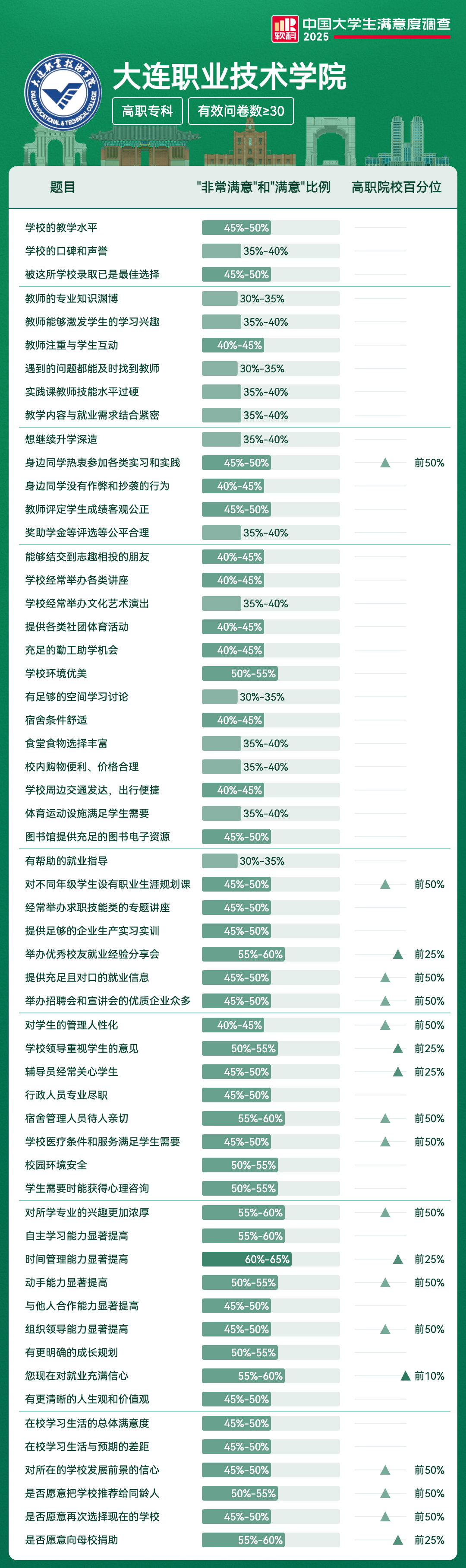 | 学校领导重视学生的意见 | 50%-55% | 前25% |