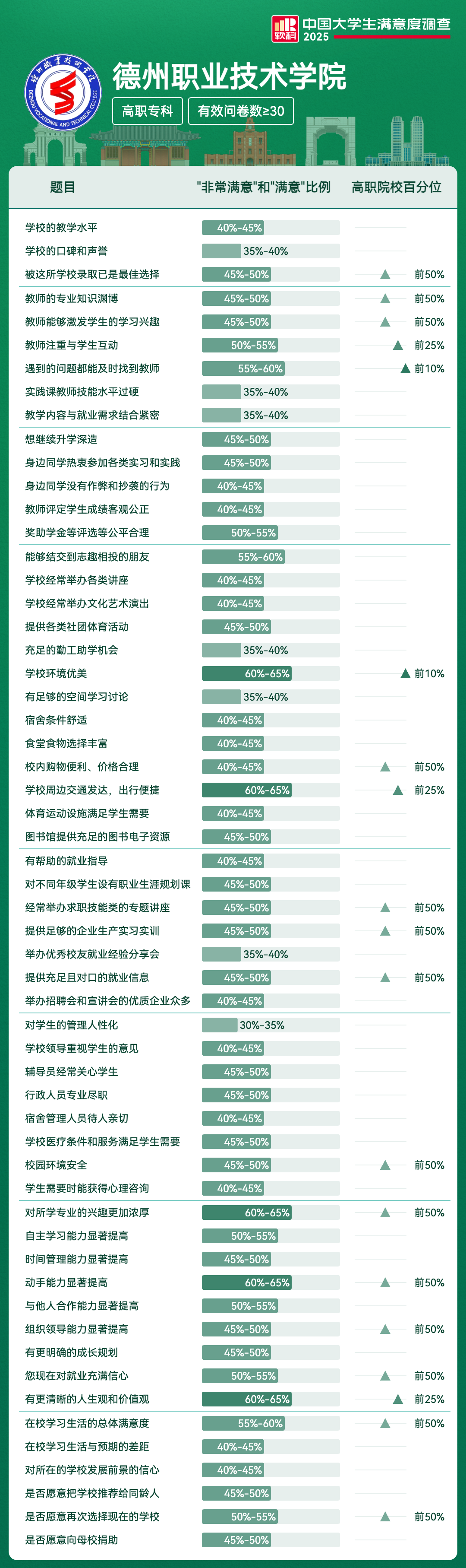 | 学校环境优美 | 60%-65% | 前10% |