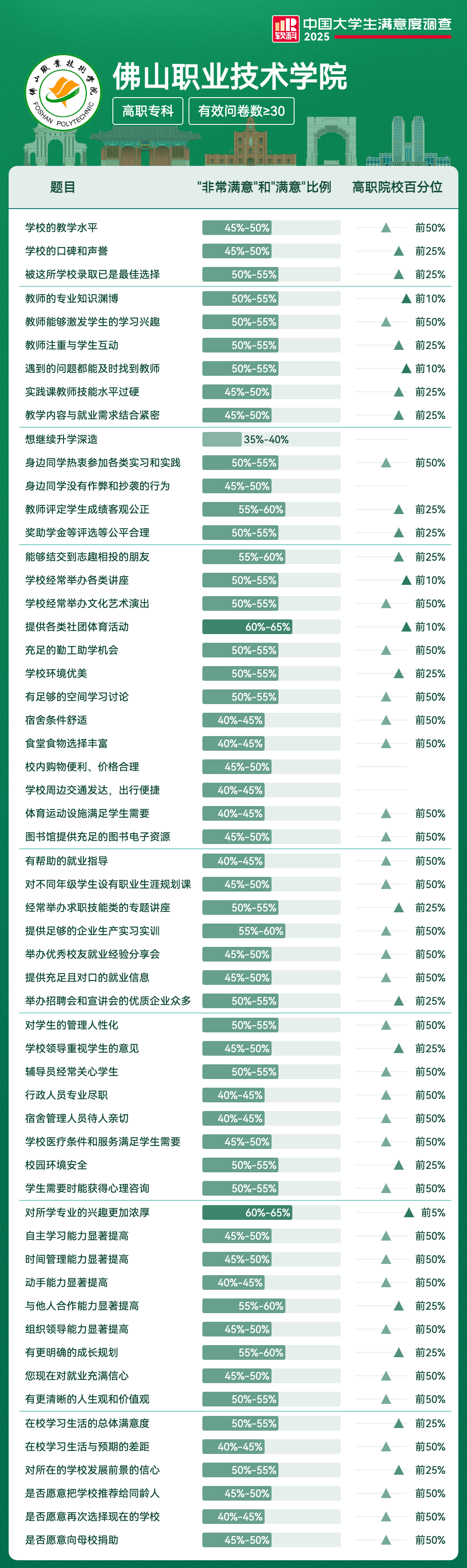 | 满意度前5项 | 满意及以上比例 | 全国高校排名区间 |