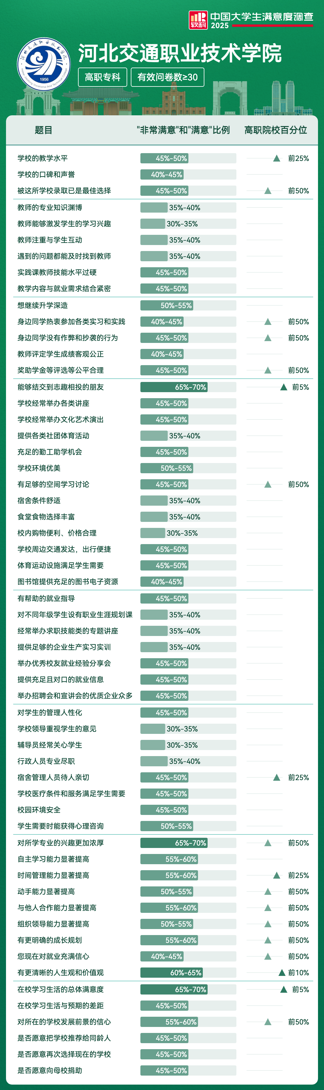 | 在校学习生活的总体满意度 | 65%-70% | 前5% |