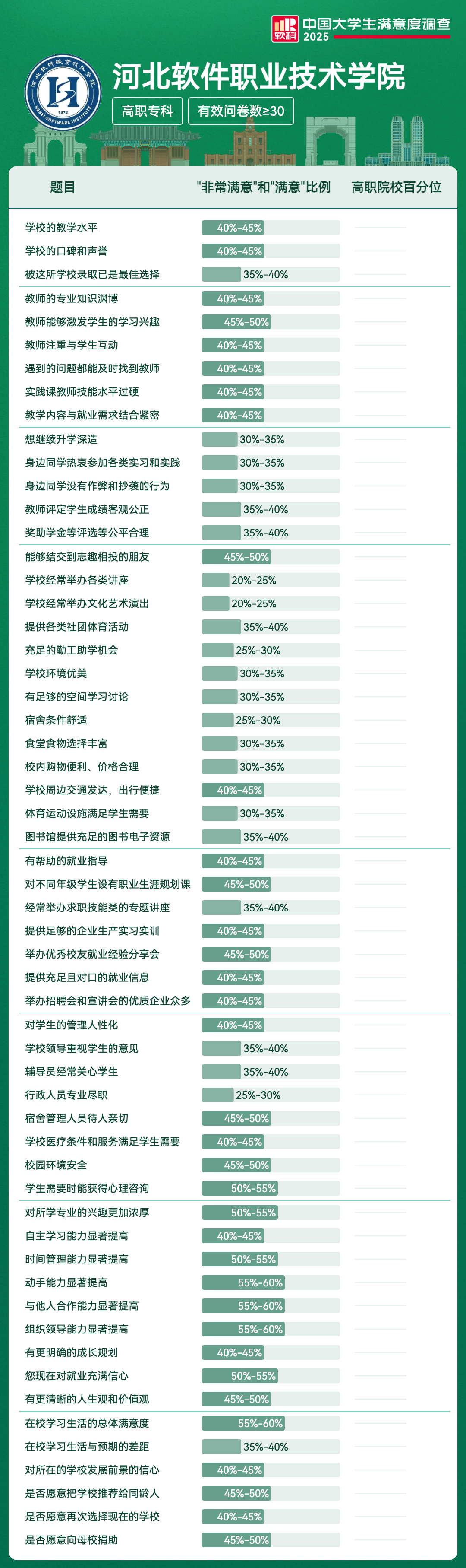 | 满意度前5项 | 满意及以上比例 | 全国高校排名区间 |