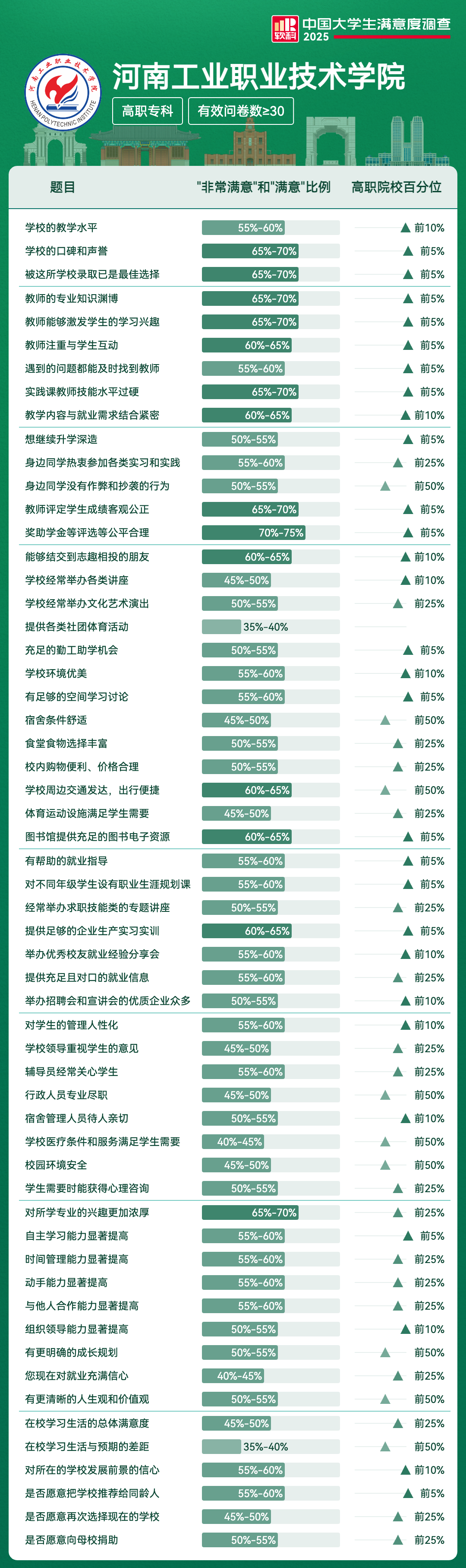 | 满意度前5项 | 满意及以上比例 | 全国高校排名区间 |