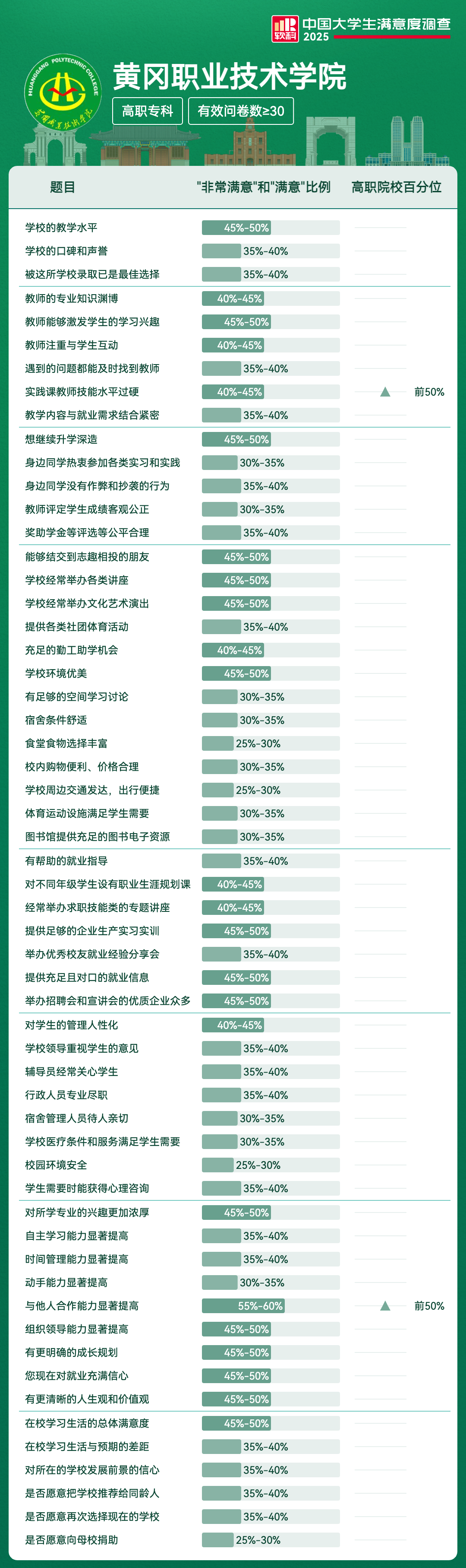 | 实践课教师技能水平过硬 | 40%-45% | 前50% |