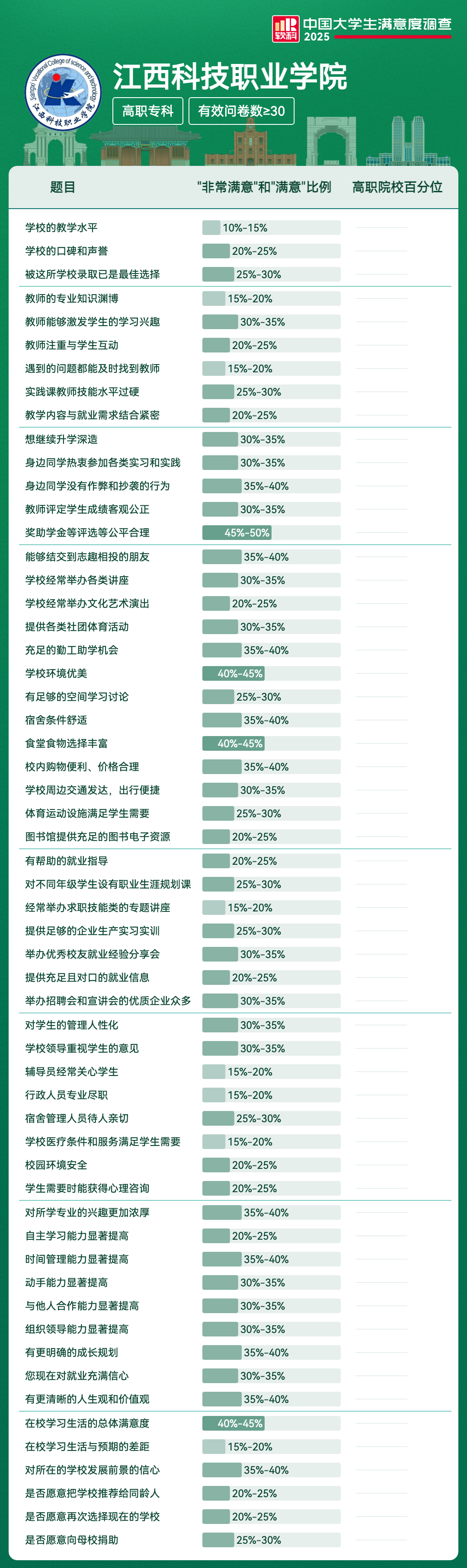 | 满意度前5项 | 满意及以上比例 | 全国高校排名区间 |