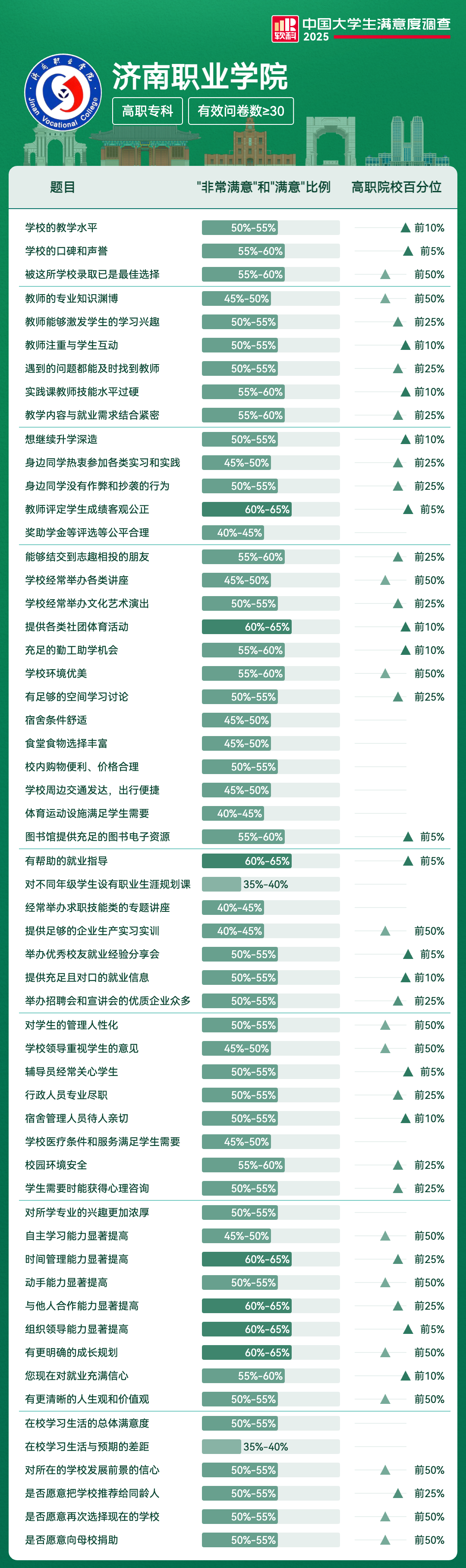 | 满意度前5项 | 满意及以上比例 | 全国高校排名区间 |