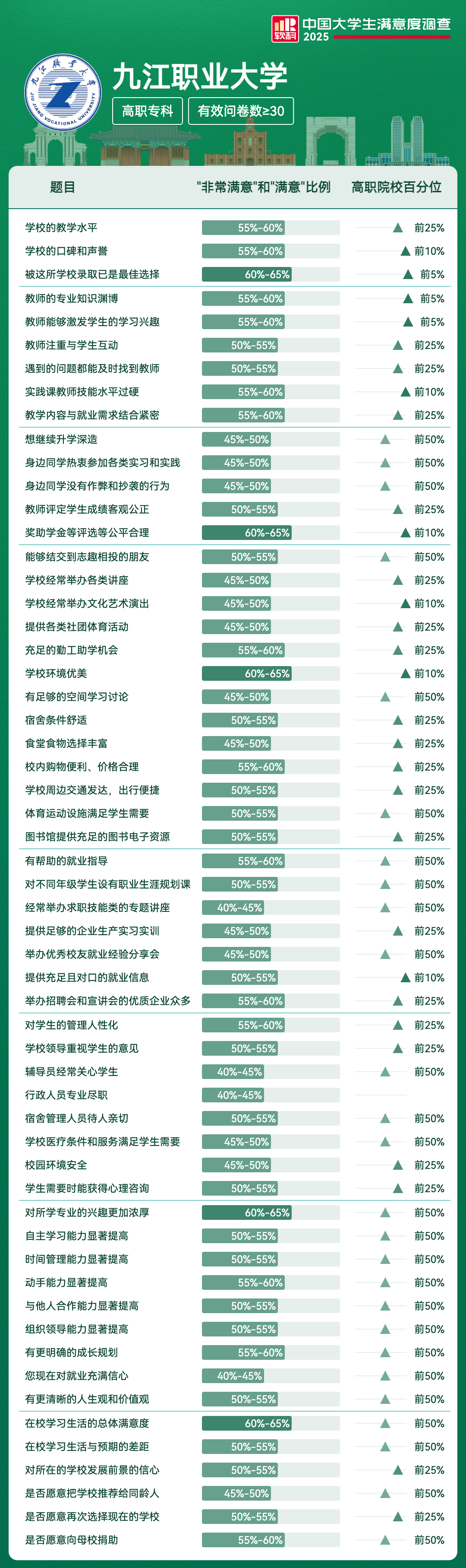 | 满意度前5项 | 满意及以上比例 | 全国高校排名区间 |
