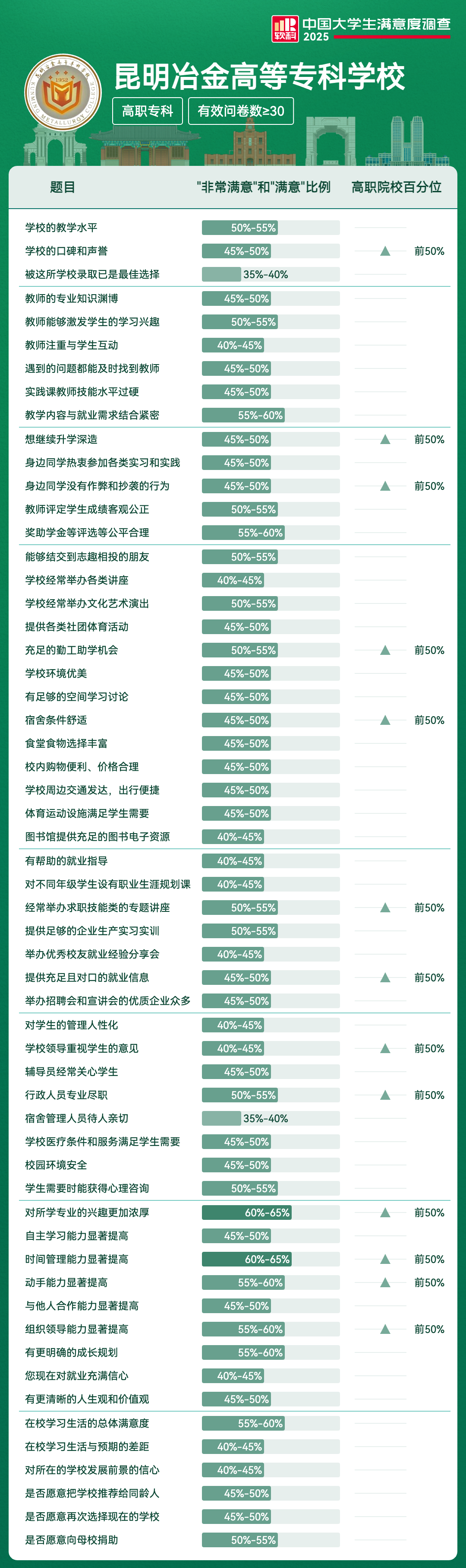 | 宿舍条件舒适 | 45%-50% | 前50% |