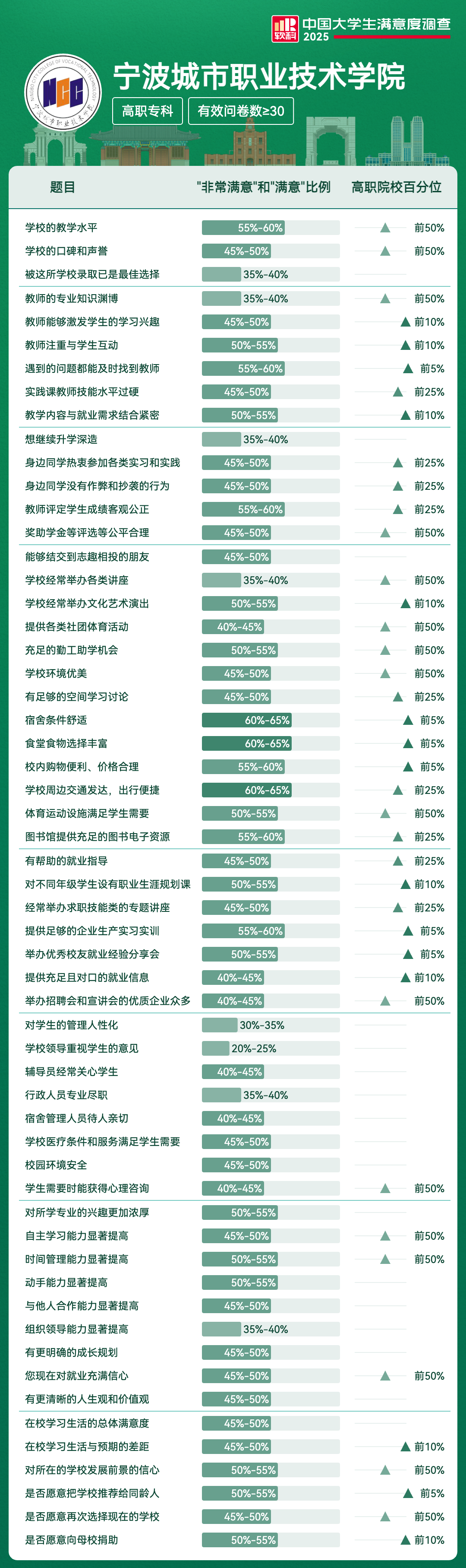 | 宿舍条件舒适 | 60%-65% | 前5% |