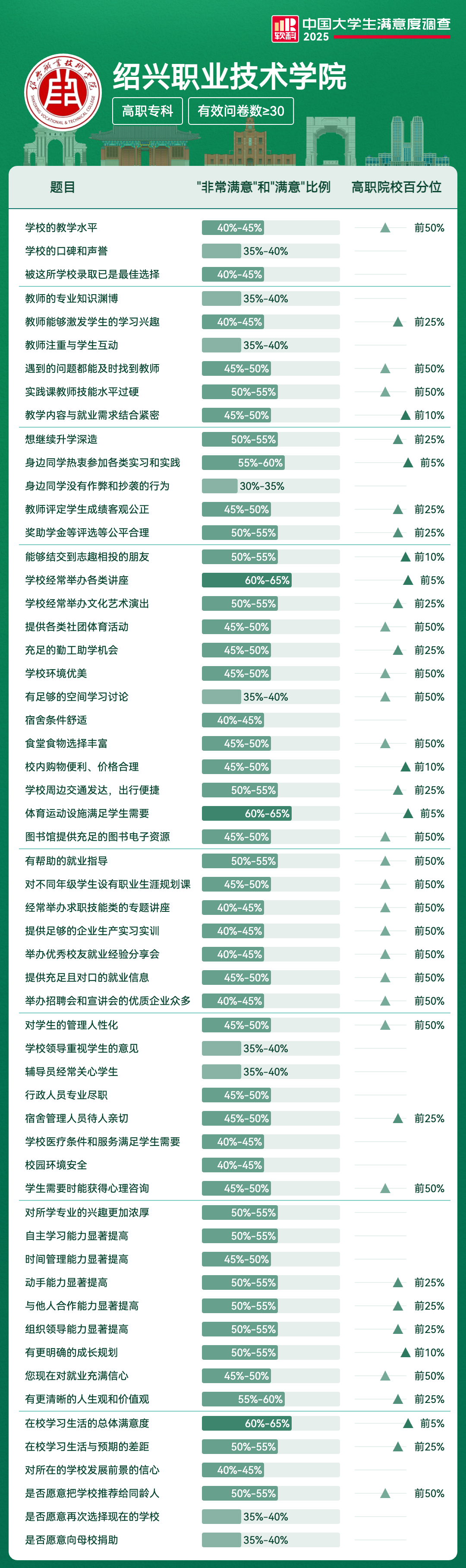 | 在校学习生活的总体满意度 | 60%-65% | 前5% |