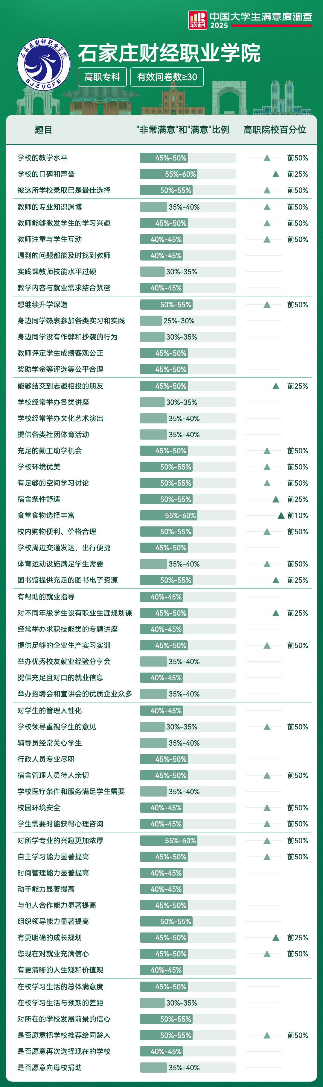 | 宿舍条件舒适 | 50%-55% | 前25% |