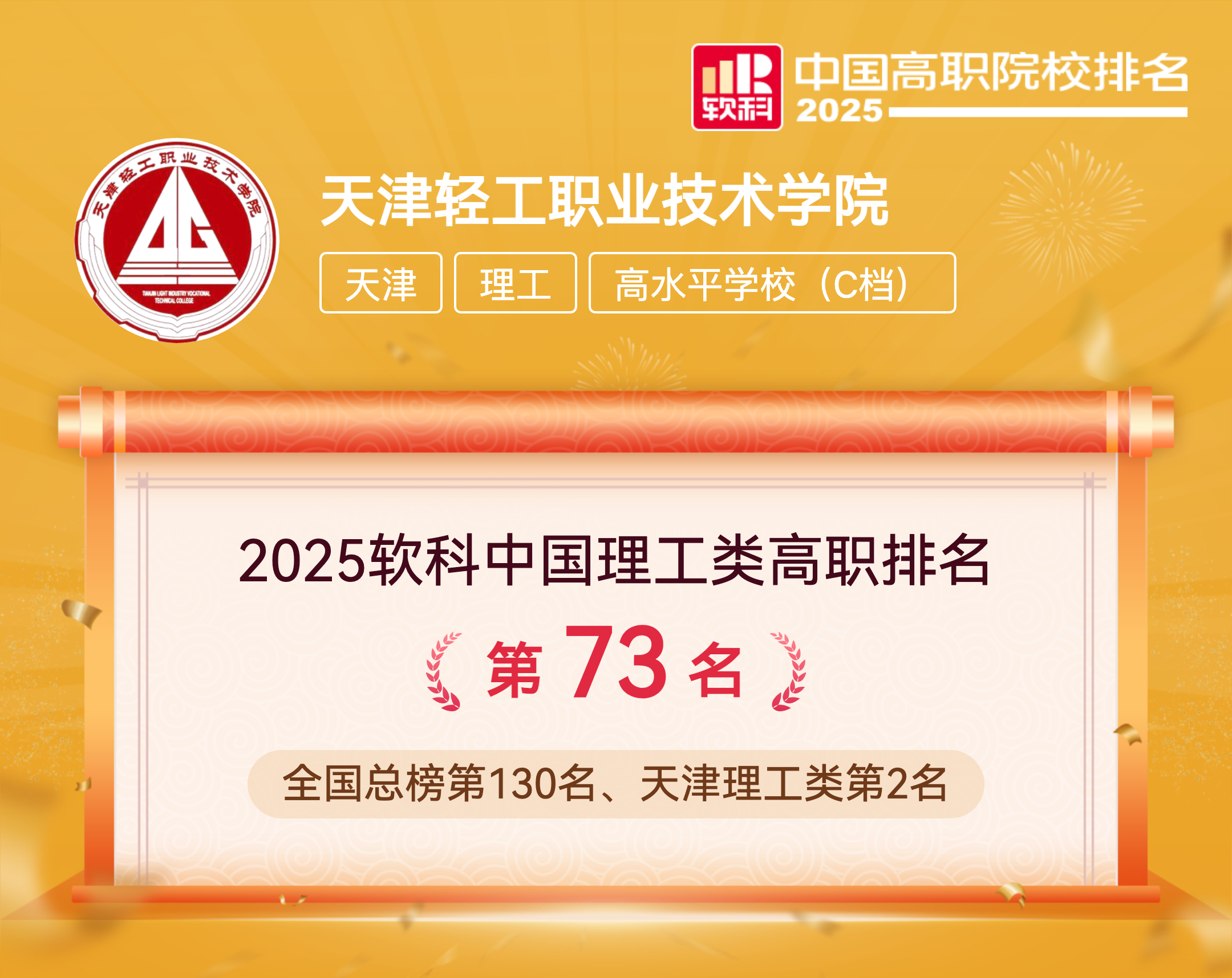 软科中国高职院校排名于2023年首次发布。排名旨在用丰富的客观数据对中国高职高专院校的办学水平进行监测式评价,为考生择校和社会了解中国千余所高职高专院校提供参考。