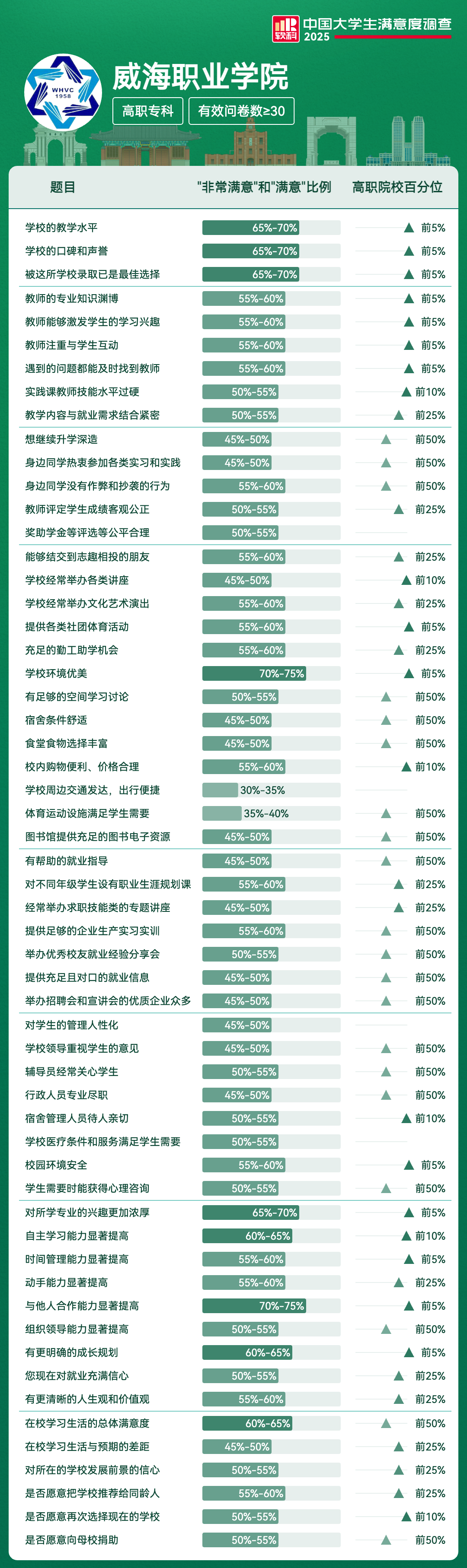 | 满意度前5项 | 满意及以上比例 | 全国高校排名区间 |