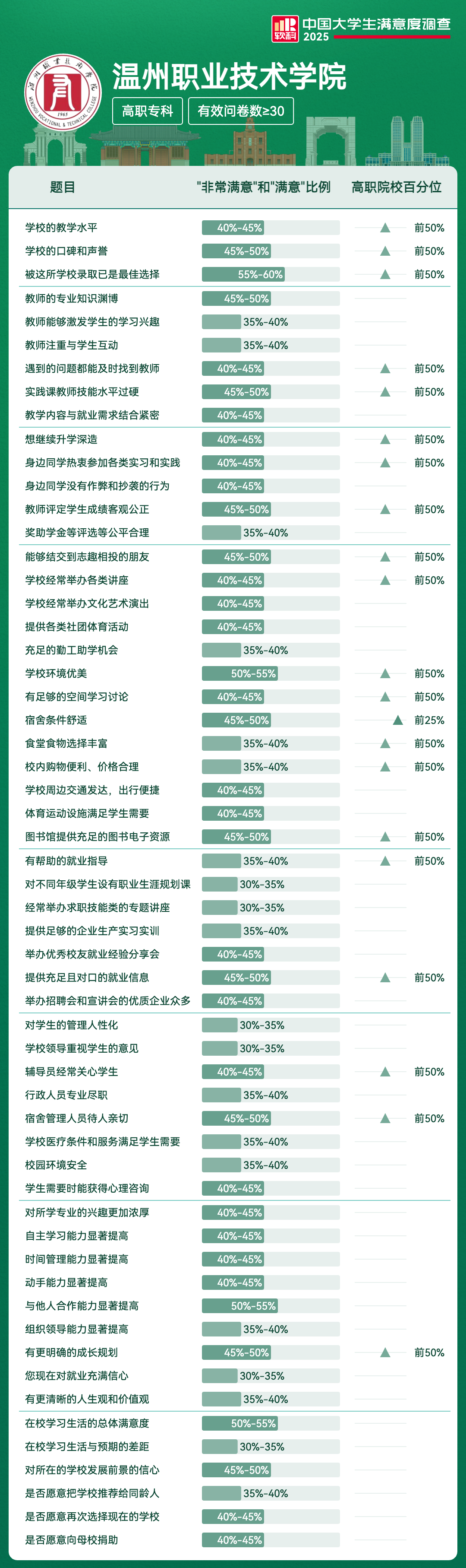 | 宿舍条件舒适 | 45%-50% | 前25% |