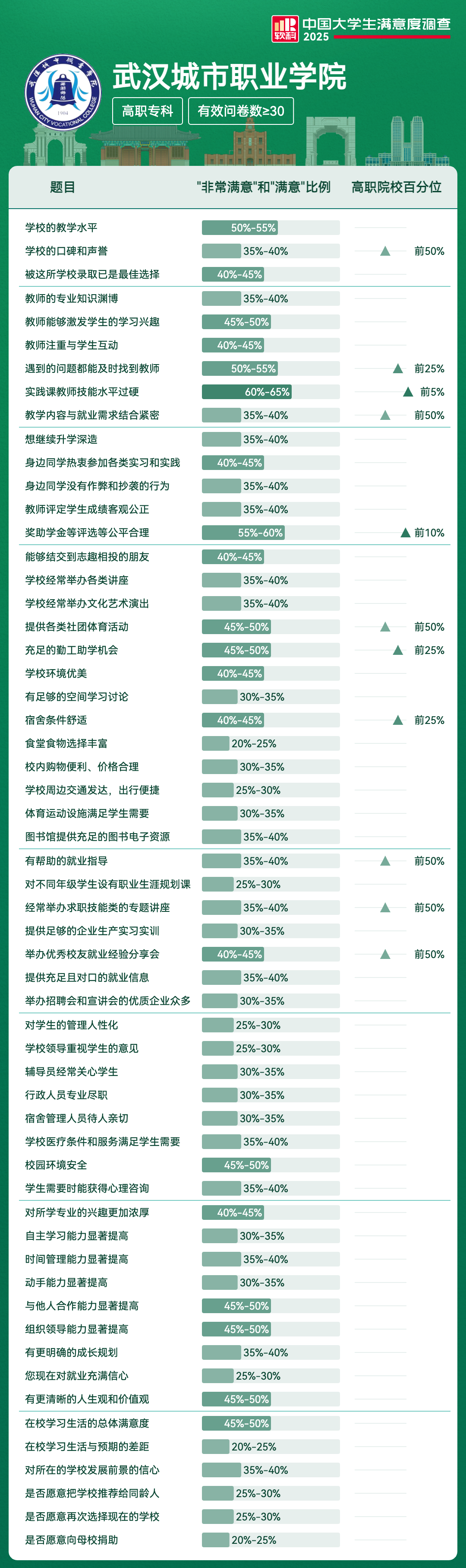 | 宿舍条件舒适 | 40%-45% | 前25% |