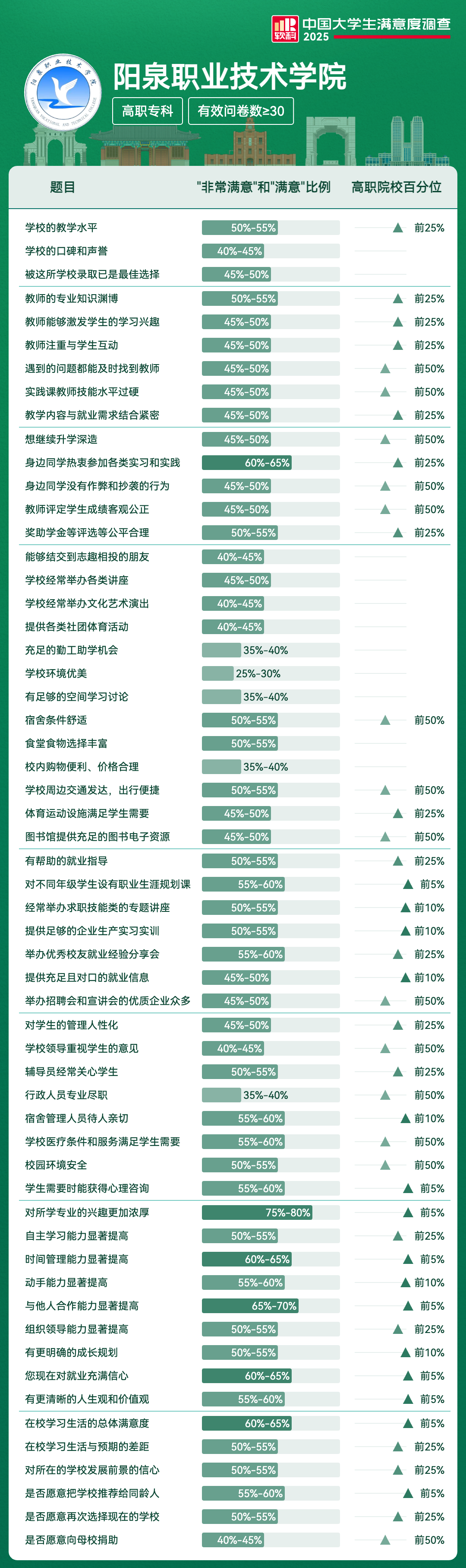 满意度前5项 | 满意及以上比例 | 全国高校排名区间 |