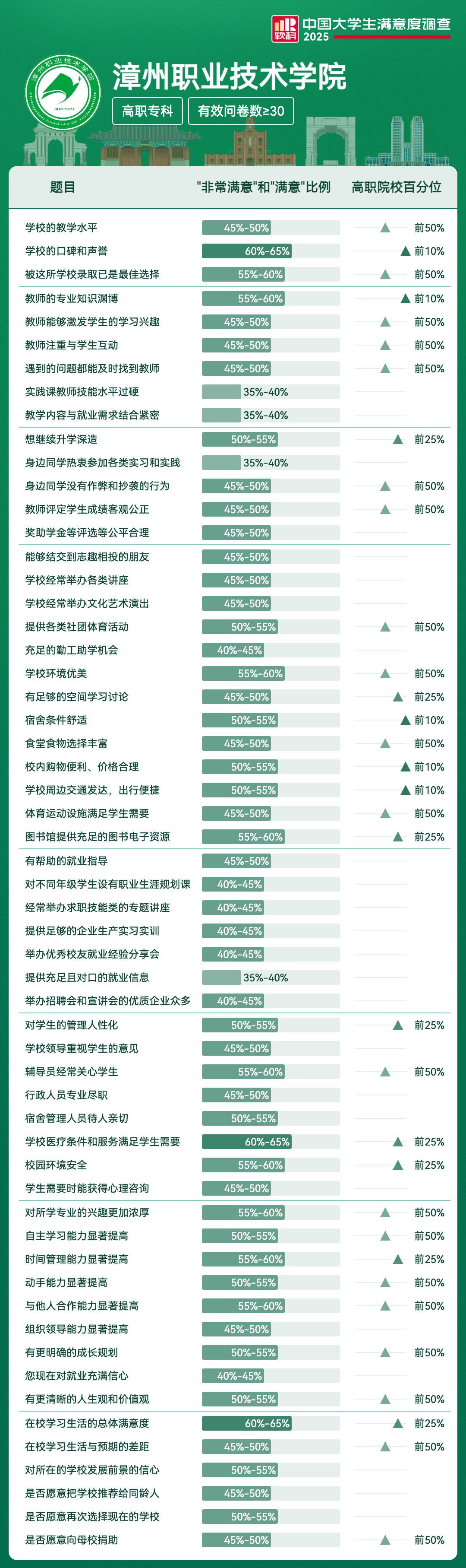| 满意度前5项 | 满意及以上比例 | 全国高校排名区间 |